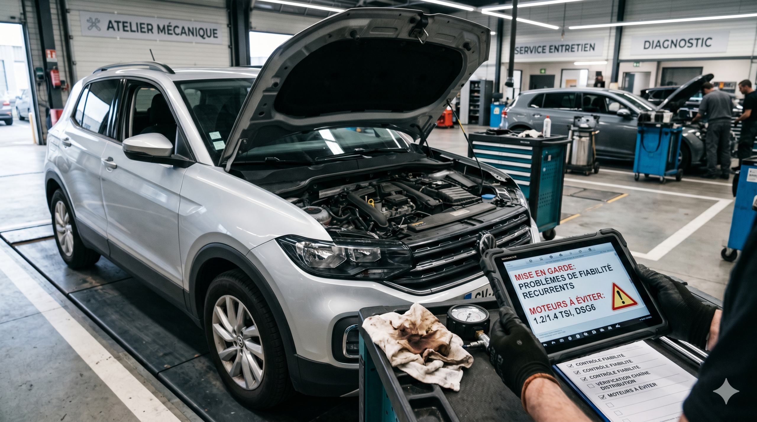 Testez toujours la DSG7 à froid et à chaud. Les défauts apparaissent surtout à basse vitesse et lors des manœuvres. Un T-Cross en DSG7 sans historique complet doit être abordé avec la plus grande prudence.
